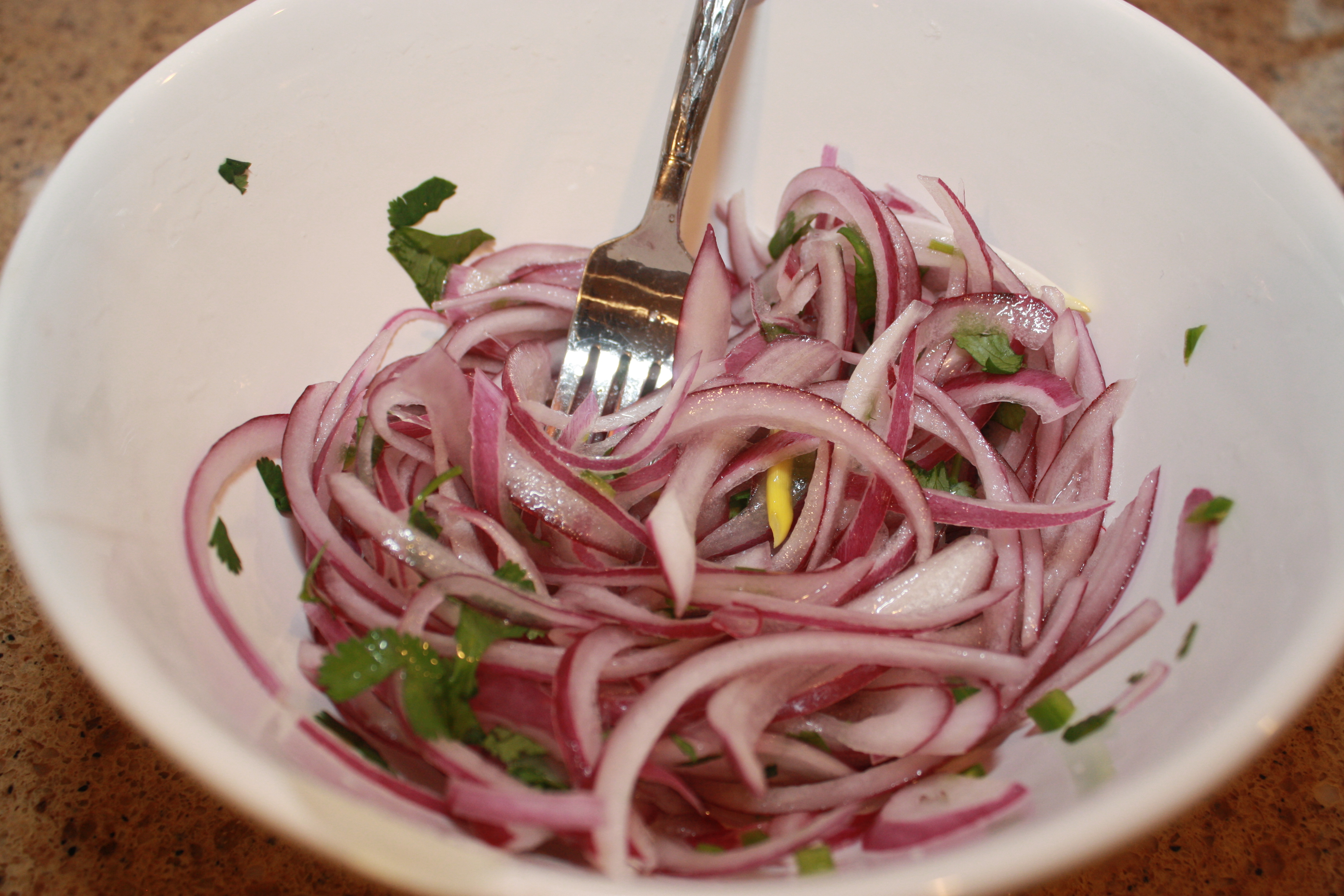 IMG_3368 Previous Next Published March 14, 2016 at 3888 × 2592 in Peruvian Cilantro Green Rice, Chicken & Salsa Criolla Lemon (or lime even), cilantro, salt and pepper, jalapeno.