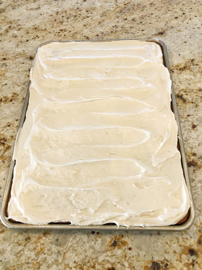 For frosting, combine butter and cream cheese and mix well with whisk attachment of mixer. Add in vanilla and powdered sugar and whip on medium-high until light and fluffy. Spread evenly on bars. Enjoy!