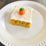I like how this recipe makes a big cookie sheet worth of bars and that I can take it along for big gatherings. I also like how the ingredients are simple and I don’t usually have to buy anything special to make them with the exception of a 15 ounce can of pureed pumpkin. Make them this weekend and I promise you everyone will love them!